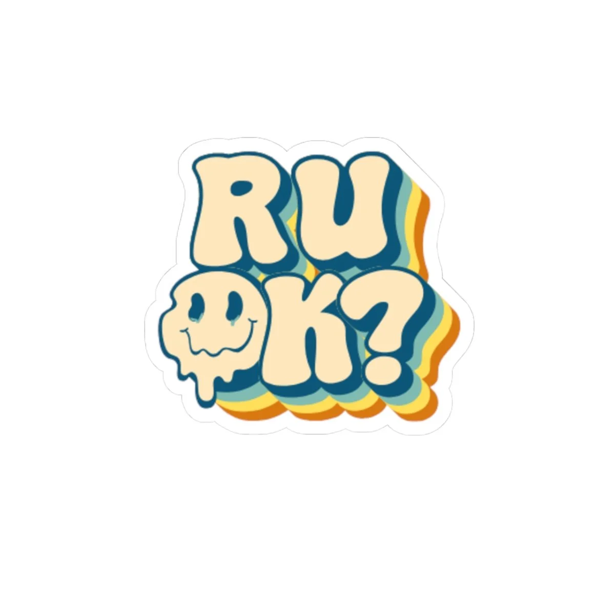 A playful, retro-inspired kiss-cut sticker that asks "RU OK?" with a melting smile icon and sunburst rainbow shadow. Its soft cream letters sit on a glossy vinyl surface that catches light and color, bringing a warm, nostalgic energy to laptops, journals, water-bottle lids, and more. This sticker speaks in a friendly, gentle way—perfect for starting conversations or leaving a small, supportive reminder on a surface someone sees every day. The vintage palette and slightly gooey lettering give it a laid-back, 70s-adjacent vibe that feels casual, sincere, and a little cheeky.